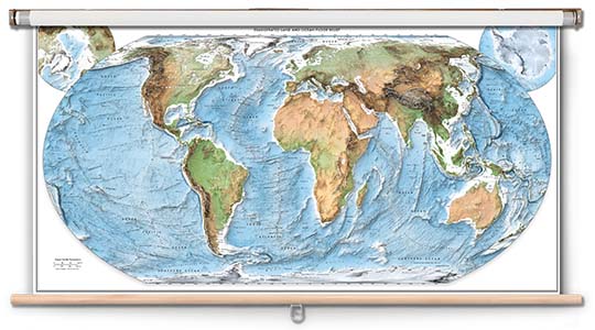 A laminated map print is mounted to a heavy-duty classroom spring roller assembly.