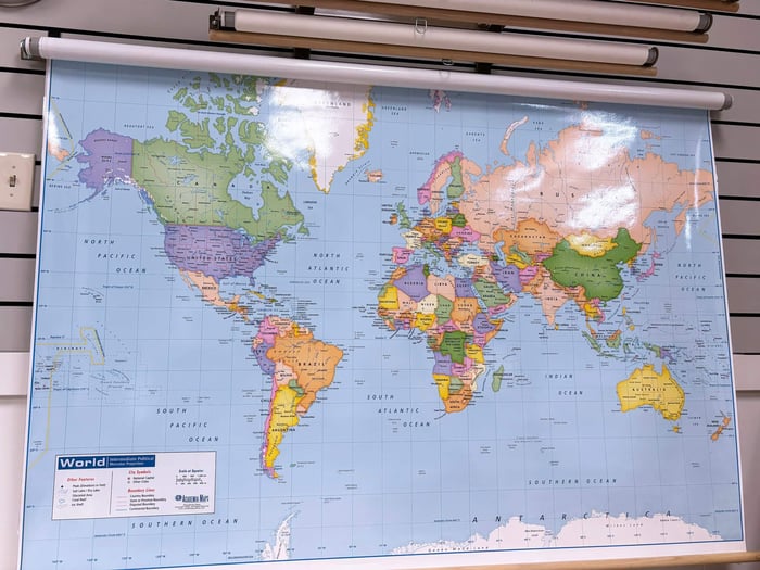 Classroom maps need to be large enough for students at the back of the room to read clearly. For most standard classrooms, you're looking at maps that are roughly four feet wide or larger - big enough that place names remain legible from 20-30 feet away. Smaller maps might be fine for small group settings or offices, but in a classroom with twenty to thirty students, bigger is generally better for visibility.
