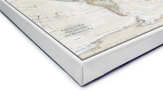 A high quality canvas print wrapped over a solid wood frame. A durable foam-board underlayer allows you to easily stick pins into the map to track your travels.