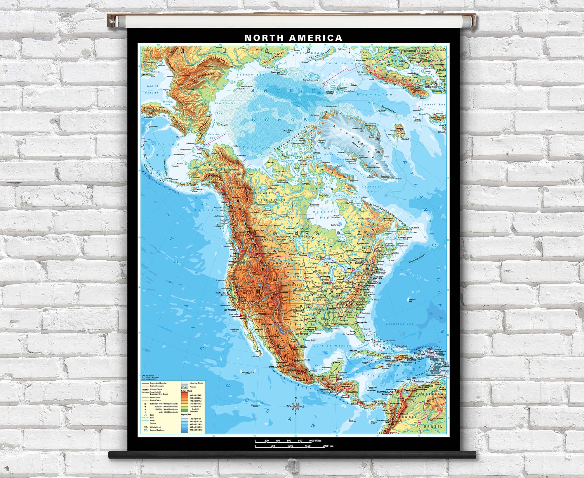 Stunning and highly informative physical wall maps for the classroom including the World, USA, Canada, continents, and regional maps. Each of these maps feature gorgeous hand-drawn shaded relief terrain reminscent of the classic Swiss Topo maps. The detailed hillshading is combined with colorful topographic shading (hypsometric tinting) representing elevation ranges. Ocean and sea bathymetry (water depth) is also colorfully reprsented on each map.